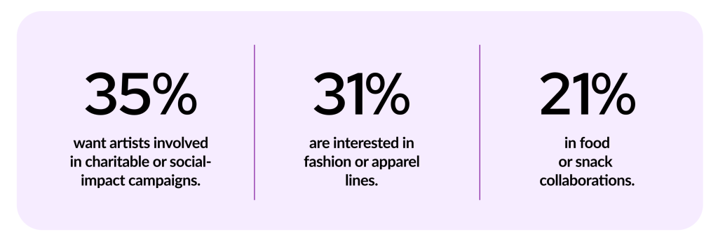 Younger audiences, especially, connect with these lifestyle extensions. Only 34% of the total sample reported that none were of interest, reinforcing just how deeply fans value connecting with artists beyond their music. Modern fans want to align with artists politically and socially—or, at the very least, wear their lipstick or luxury threads.